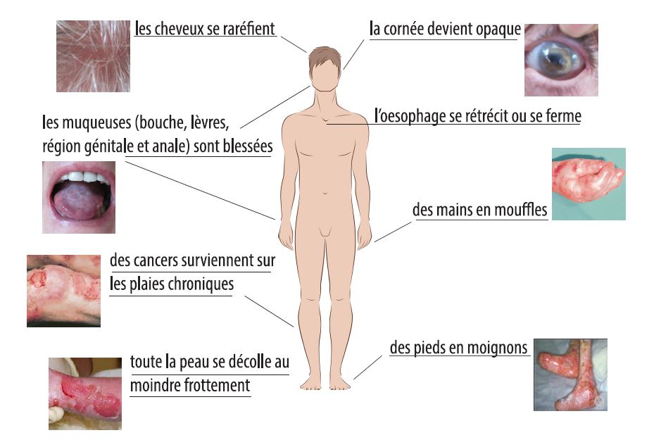 Tout au long de leur existence, ils souffrent de lésions sur l’ensemble du corps, sur les muqueuses comme la bouche, l’œsophage, les voies respiratoires et la cornée.
