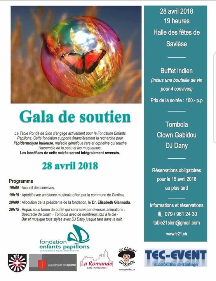 La dynamique et engagée Table Ronde 21 de Sion a mis sur pieds une soirée de gala à son image à la Halle des Fêtes de Savièse en faveur de la Fondation Enfants Papillons. Les membres organisateurs ont su rendre cette salle conviviale, ont agrémenté la soirée par diverses animations dont le clown Gabidou, ont donné l’espace pour présenter les projets et les engagements de la Fondation. Près de 120 personnes y ont participé dans la joie et la bonne humeur, en profitant de se régaler au magnifique buffet indien offert par le Restaurant La Romande à Sion.