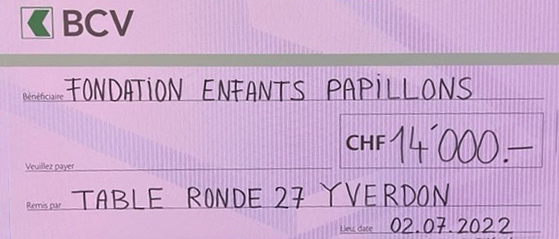 Un numéro inconnu s’affiche sur mon natel le 3 juin 2022…Contrairement à mon habitude, malgré mes gants de jardinage, je prends la communication, qui m’annonce que la Table ronde N°27 d’Yverdon a choisi la Fondation Enfants Papillons comme bénéficiaire de son action sociale 2021.