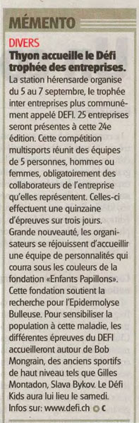 Les organisateurs de Défi , le Trophée sportif des Entreprises, Monsieur Jean-François Gailloud et Madame Marie-Hélène Heusghem, ont offert pour la deuxième fois une place à la Fondation Enfants Papillons pour le 24 ième Défi, l’édition 2013 (www.défi.ch) . Celle-ci s’est déroulée à Thyon 2000 du 5 au 7 septembre et a vu naître une Equipe Papillon, engagée avec tout son cœur pour défendre les couleurs et la cause des enfants papillons, avec le dossard numéro 1.